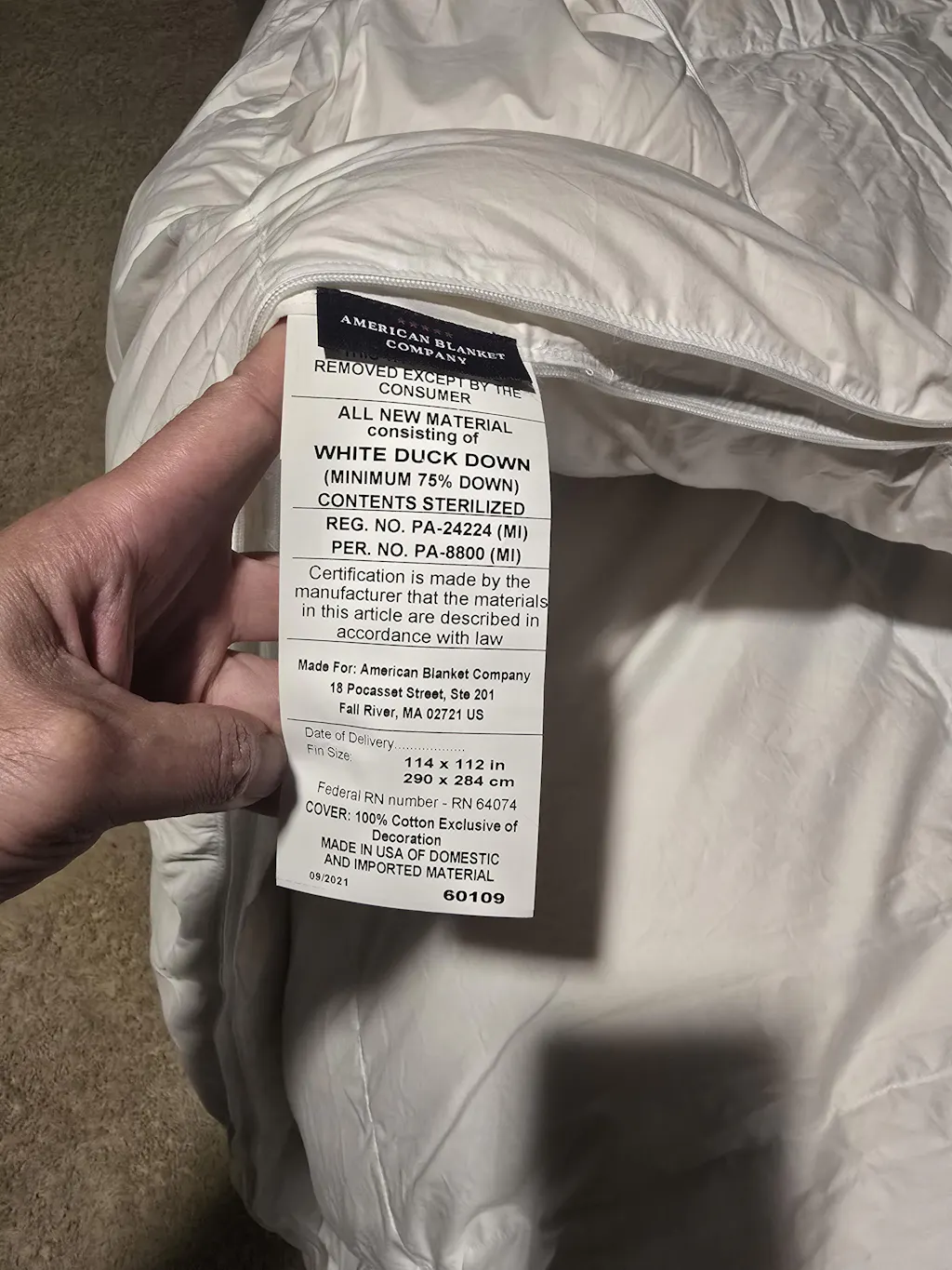 I received the Down Comforter and used it last night. It is so comfortable and the quality is immediate. My wife and I really like it. However I noticed that one of the squares is empty. I don't think it takes away from the comforter as a whole though. I'm still happy with it. Just to let you know.